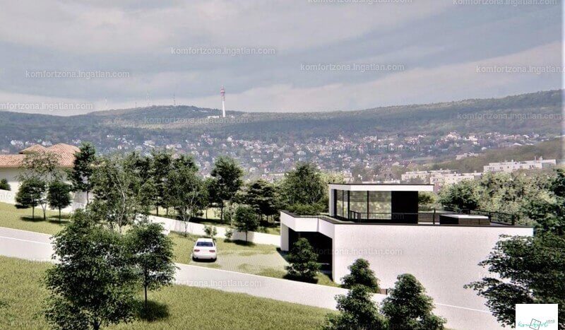 ÜRÖMHEGY- ARANYHEGY dinamikusan fejlődő részén modern új építésű házak környezetében 1422 nm összközműves, panorámás telken épül 2 db önálló családi ház.